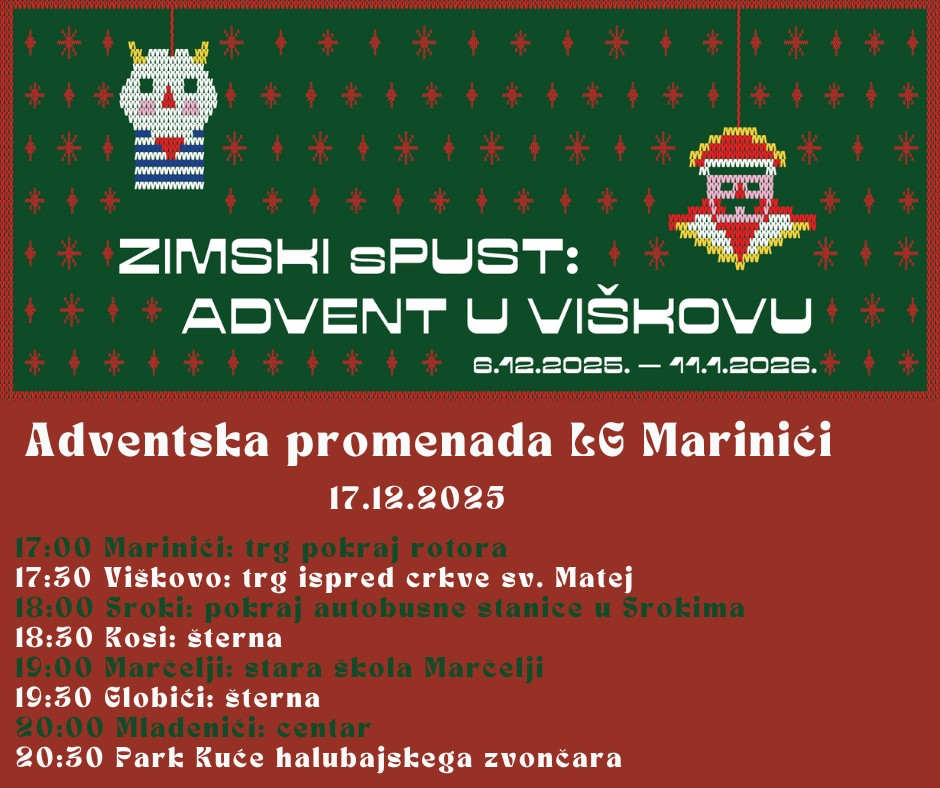Adventska promenada Limene glazbe Marinići održati će se 17. prosinca 2025. s početkom u 17.00 sati, uz zaustavljanja u naseljima općine Viškovo: